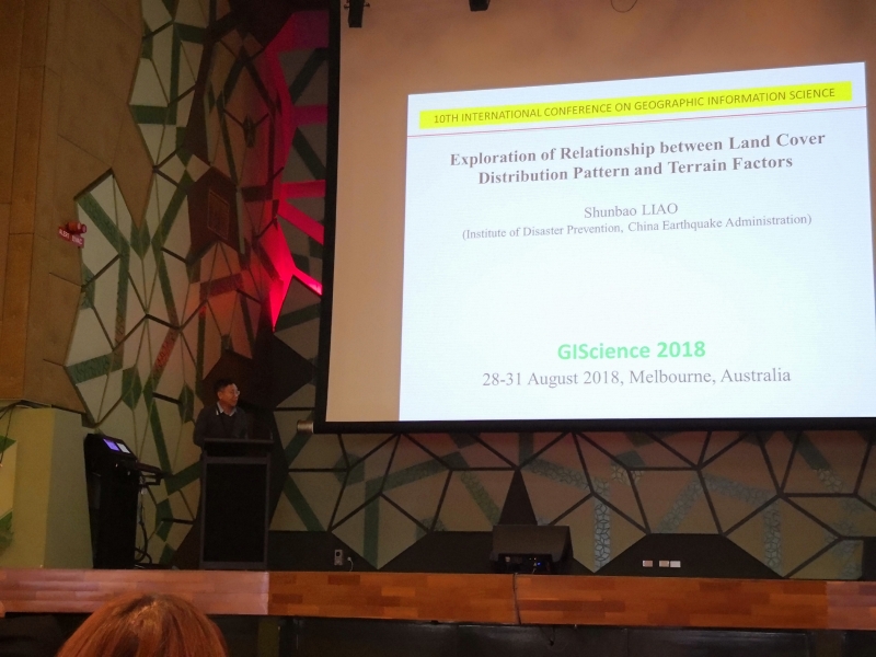 在专题研讨阶段,廖顺宝教授参加了“空间大数据与机器学习”专题的研讨,该专题围绕6个方面的问题进行自由发言和讨论,其中,关于空间大数据与机器学习的应用前沿以及过分依赖空间大数据与机器学习的缺点与局限等两个问题的发言得到了参会人员的热烈响应和普遍认同。在大会分组报告阶段,廖顺宝参加了“空间分析”模块的交流,并做了题为《Exploration of Relationship between Land Cover Distribution Pattern and Terrain Factors》的学术报告,介绍了近年来在这一领域的最新研究成果。通过与国际同行的交流互动,进一步了解了地理信息科学的最新发展趋势、研究重点和热点,为今后的研究、教学指明了方向,同时也加深了国际同行对防灾科技学院的了解。