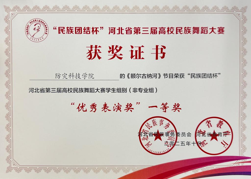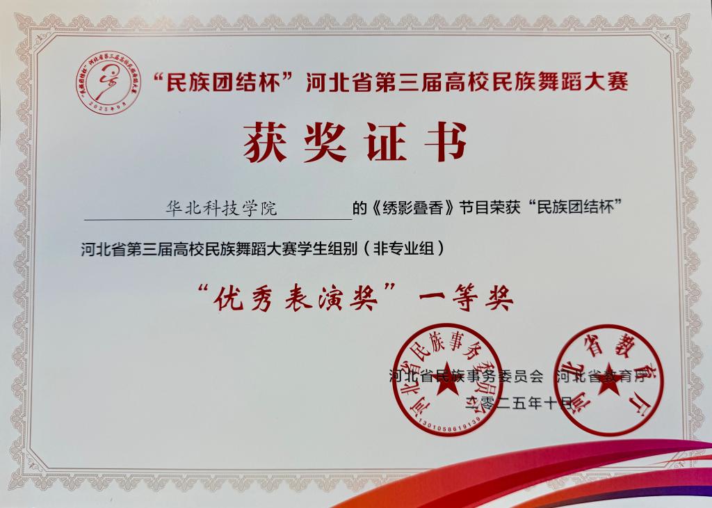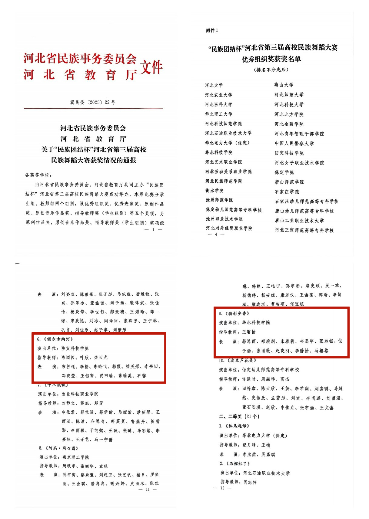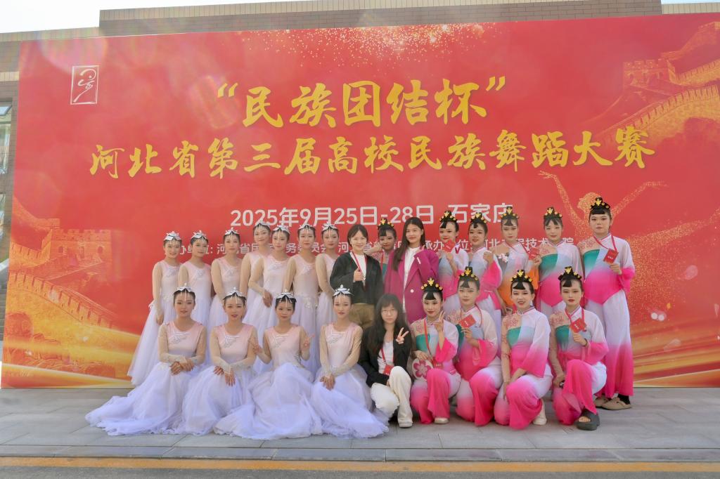 “民族团结杯”河北省第三届高校民族舞蹈大赛自2025年5月启动以来,校团委积极组织筹备,围绕“中华民族一家亲、同心共筑中国梦”大赛主题,精心设计排演了蒙古族舞蹈《额尔古纳河》与汉族民间舞《绣影叠香》2项作品,在为期数月的紧张筹备中,校团委老师和舞蹈演员们全心投入,利用课余和暑假时间加紧排练,反复打磨每一个动作与表情,力求在舞台上完美呈现民族舞蹈的韵味与精神。最终,上述提交的2项作品凭借鲜明的民族风格、同学们扎实的表演功底、极具感染力的情感表达,赢得评委的一致肯定,从全省66所高校的380个舞蹈作品中脱颖而出,均荣获优秀表演奖一等奖。