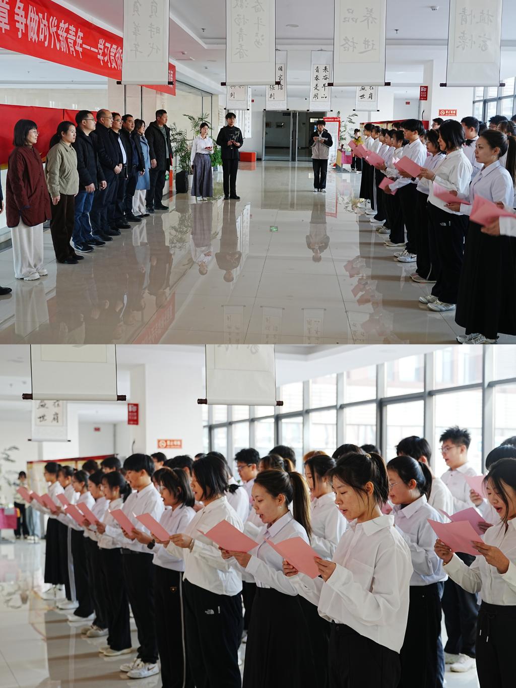 仪式上,学生代表朗诵了《梦想照亮中国》,以饱满的情感抒发了新时代青年对中华民族伟大复兴的坚定信念、对幸福生活的美好向往以及个人与国家命运紧密相连的深厚情感。随后50名学生集体朗诵习近平总书记对青年的寄语,彰显出青年学子听党话、跟党走,以奋斗姿态践行使命担当的精神面貌。