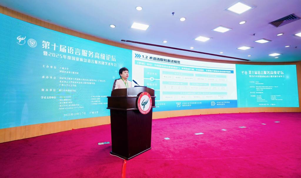 12月6日至7日,第十届语言服务高级论坛暨2025年度国家应急语言服务团学术年会在广州大学隆重举行。来自全国内地及港澳地区50余所高校及语言科技企业的120余位语言服务领域的专家学者与行业代表齐聚一堂,聚焦“数字中文建设与语言服务”“平安中国建设与应急语言服务”两大核心议题展开深度交流,共谋语言服务高质量发展路径,为中国式现代化建设贡献语言服务的力量与智慧。教育部语信司、教育部语用所、广东省委网信办、广东省教育厅、广州市教育局和广州大学相关领导在开幕式上致辞。我校经济管理学院王慧彦教授应大会邀请作主旨报告。