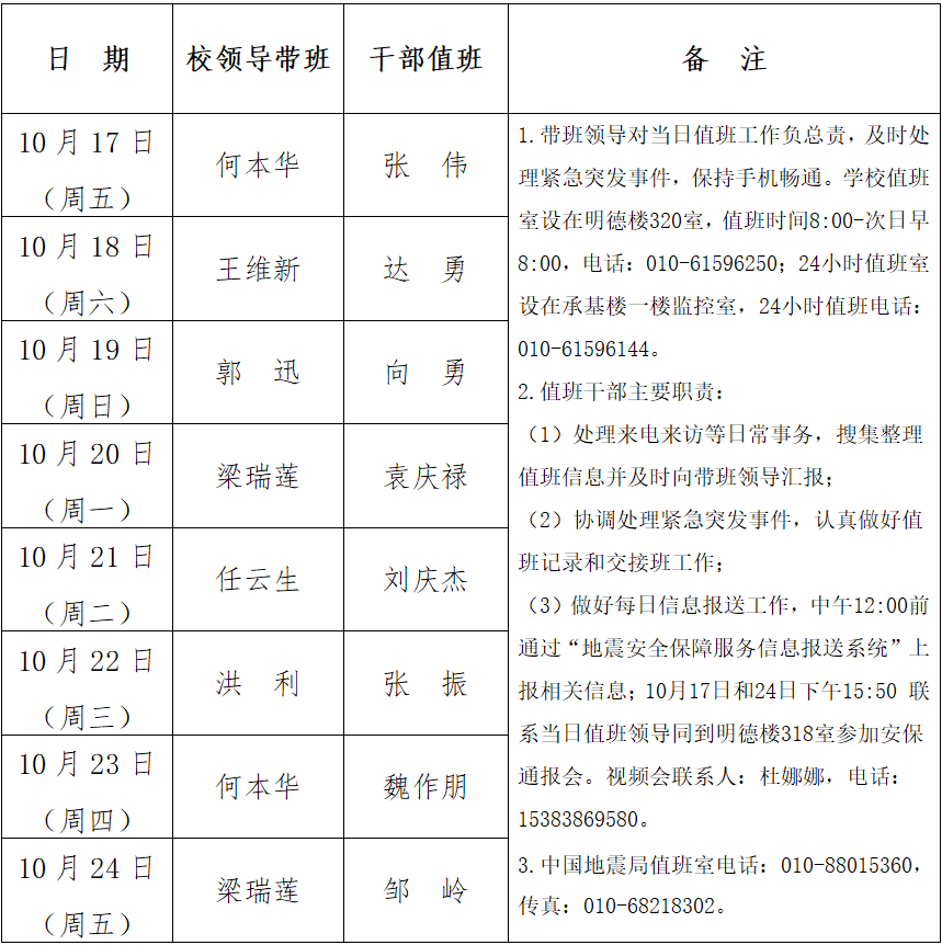 为贯彻落实中国地震局《党的二十届四中全会地震安全保障服务实施方案》的通知要求,地震安保时段为10月17日至10月24日,现安排值班工作如下: