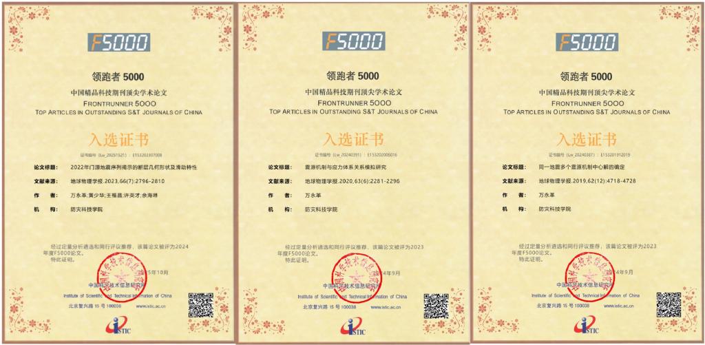近日,科技部中国科学技术信息研究所发布2025年度“领跑者5000——中国精品科技期刊顶尖学术论文(F5000)”入选论文名单。我校地球科学与工程学院万永革教授研究组论文《2022年门源地震序列揭示的断层几何形状及滑动特性》成功入选,体现了我校在地震发生背景与动力学等相关领域取得了一系列值得关注的重要成果。